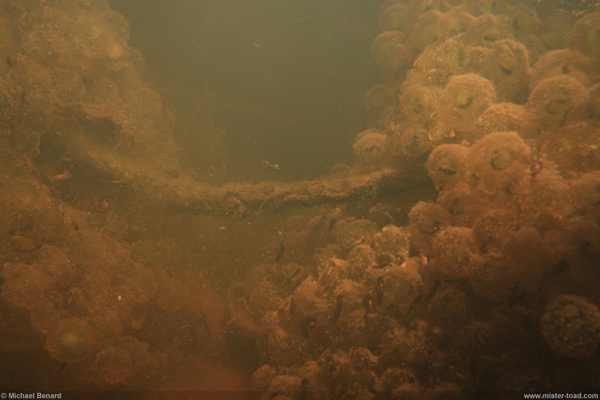 The photo above shows an underwater view of Wood Frog eggs. Many of the eggs are close to hatching, and a few of the eggs have already hatched. |
