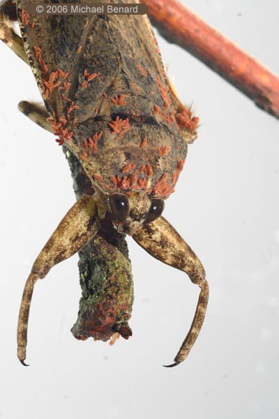 Giant water bugs (Lethocerus americanus) are large (over two inches long) insects that spend most of their lives in bodies of water such as ponds and lakes. They are predators, capturing prey with raptorial forelimbs, and then killing prey with an injection of venom that aids digestion. Giant water bugs are capable of capturing and consuming small vertebrates such as fish and frogs. The photograph above shows a giant water bug from Napa Co., California. The small red bumps on the bug are mites.