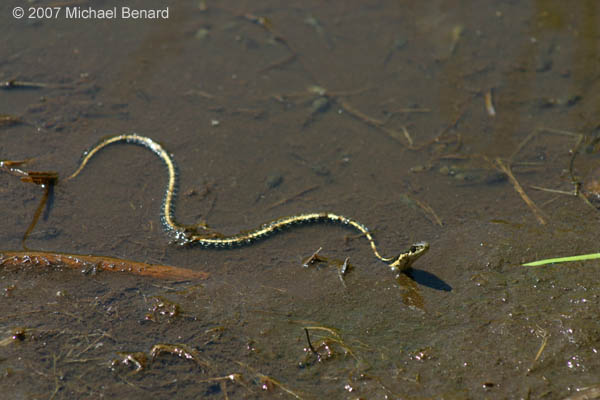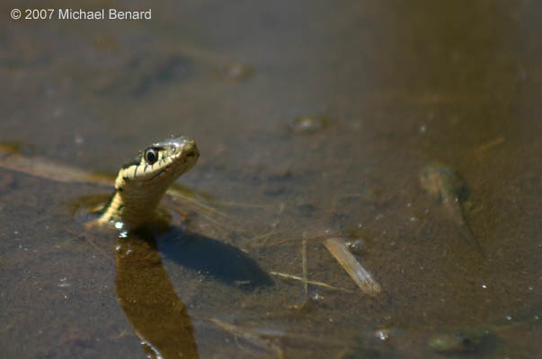 A Mountain Garter Snake (Thamnophis elegans) observed one sunny summer afternoon in Yosemite National Park. This snake spent about 20 minutes hunting and eating pacific treefrog tapdoles in a drying pool in a meadow. When the snake first entered the water, it looked quite slim, but by the time it left the its skin was stretched tight between its scales due to the load of tadpoles it had swallowed. |